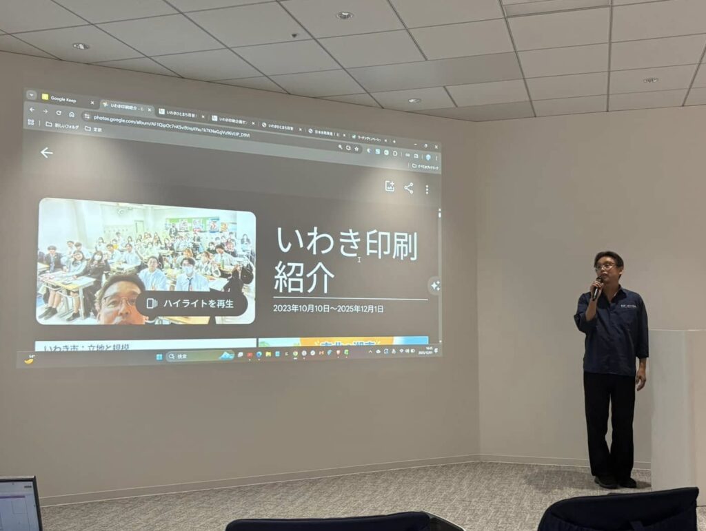 株式会社いわき印刷企画センターは1965年創業の印刷会社で、「いわきマーチング委員会」として活動している。同社はDTFプリンターなどグッズ製作ができる設備を擁し、スタジオも持っている。地元の学校長との縁で、台湾高雄市の日本人学校のイラストを提供して現地との交流を深めたり、地元の産学官連携のセミナーに参加したり、美空ひばり像など地元コンテンツのマグカップやTシャツ、マグネットステッカー、缶バッジなどをお土産店やサッカー試合会場、展示会などに卸したりしている。地域グッズのガチャ「ご当地ガチャ」も成功し、「カプセルトイ協会」を作り、記者会見を行ったところ、多くのメディアが集まった――以上のことを鈴木一成社長がプレゼンテーションした。