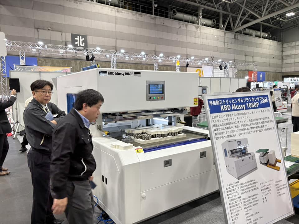 86社以上のメーカー、ベンダーが出展していたが、見どころは主催者である印刷機材商社の株式会社光文堂のブース。デジタル加工による段ボールや紙器の抜き、貼り、ムシリ、筋入れから製函、段ボール箱のラッピングロボットまでの最新鋭機器が並んだ。