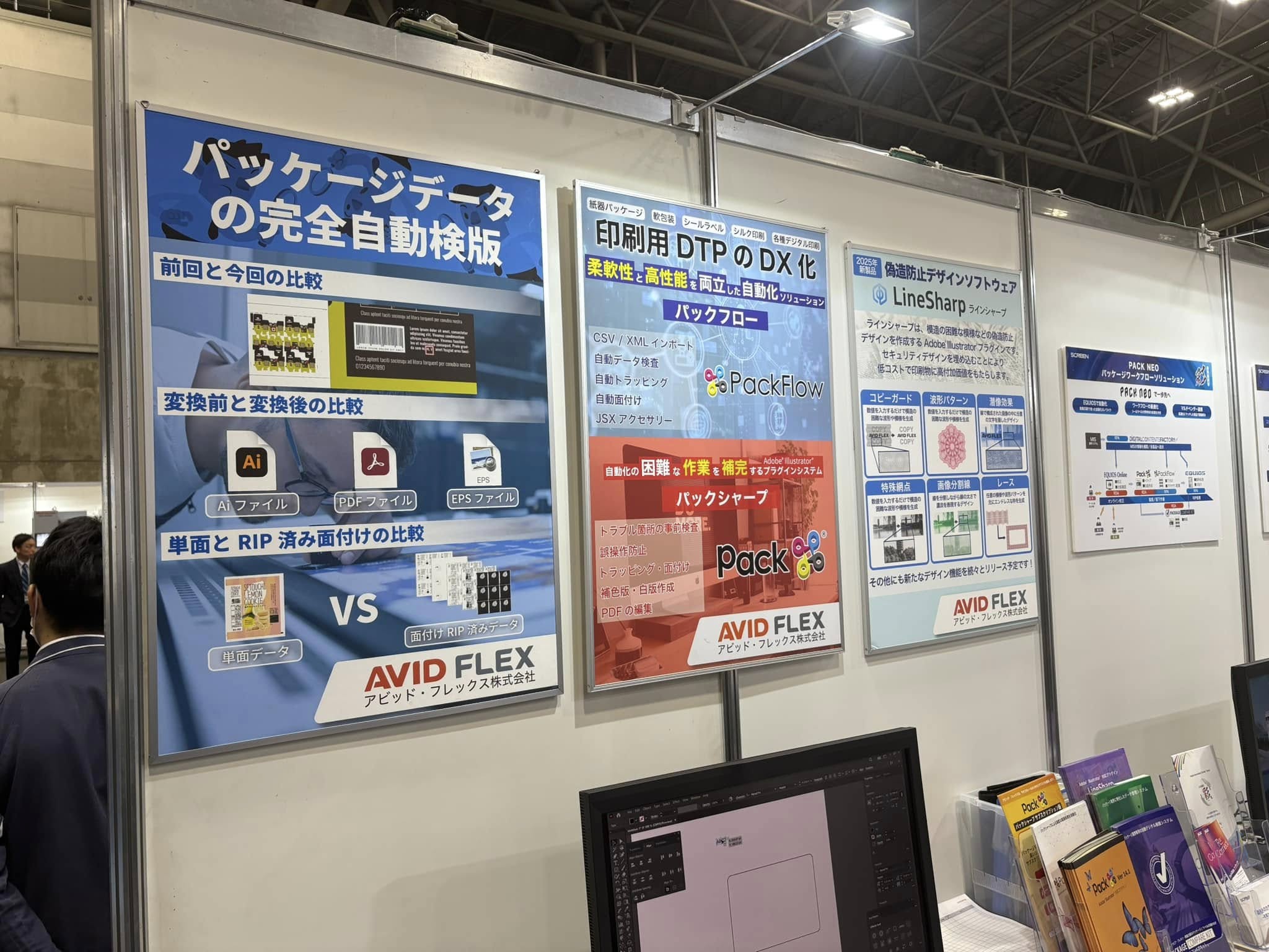 メーカー・ベンダーからもトナー方式のデジタル印刷機からソフトウェアまでが出展された。アビッド・フレックスの「パックフロー」は高度なトラッピングや面付けなどを自動化する。