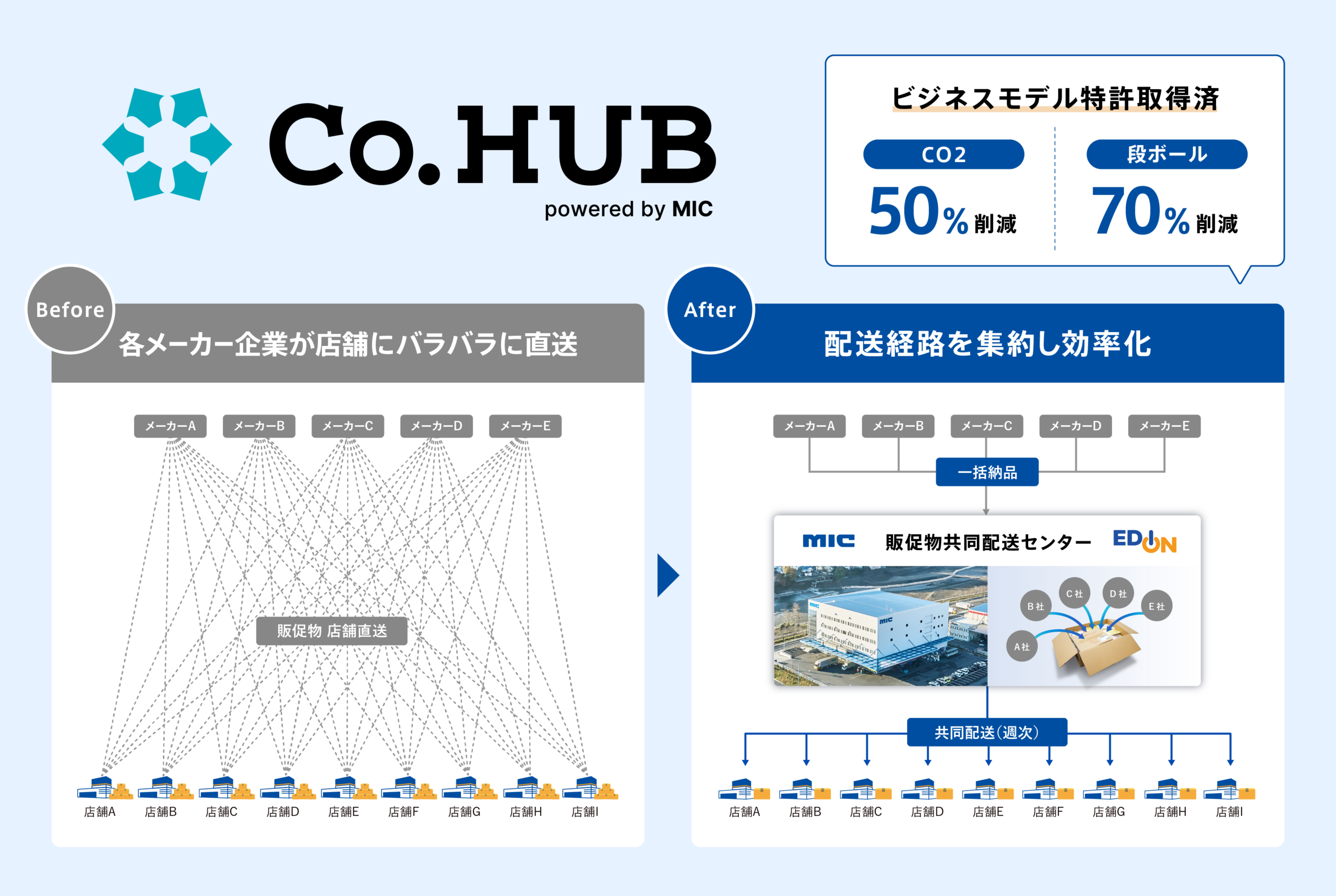 「Co.Hub」は、これまで各メーカーから各小売店舗に届く月約100箱の段ボールのうち約半数は容積率40%以下と無駄が多かった販促物を、一度同社の物流センターに集約し、共同配送することで劇的に効率化する仕組み。同社の掲げる「リテール販促360°フルサービス」のファーストステップに位置付けられ、ビジネスモデル特許を取得、2025年にはグッドデザイン100にも選ばれている。