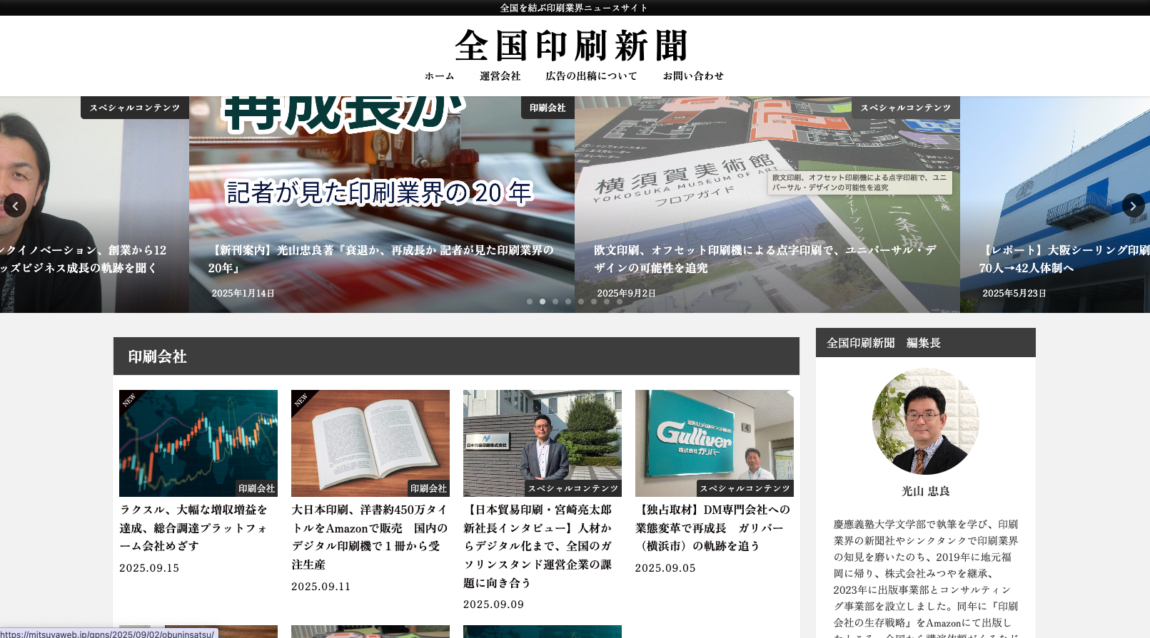 全国を結ぶ印刷情報サイト「全国印刷新聞」。経営の参考に資するをニュースをご提供するとともに、コラボレーション(作業交流)を促進する協力会社の情報も網羅。最新の業界トレンドやオピニオンもお届けしています。